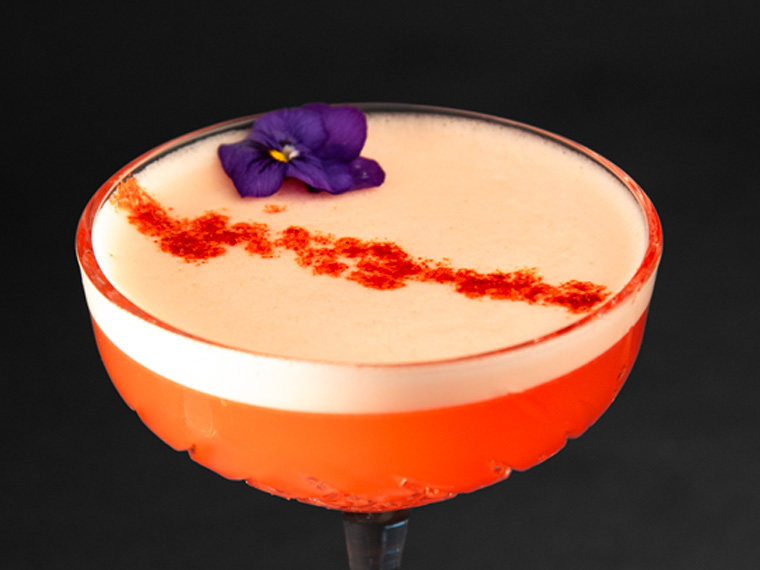 Pisco, jus de citron jaune, sirop d’agave et blanc d’œuf, relevés d’une touche de sauce piquante et de mûre fermentée.