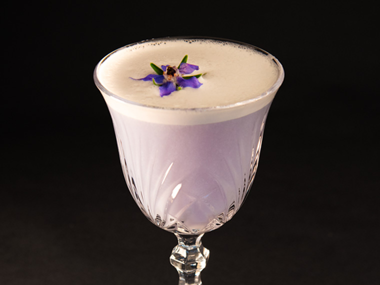Gin, sirop de myrtille et jus de citron s’accordent dans une fraîcheur cristalline, allongée d’eau gazeuse.