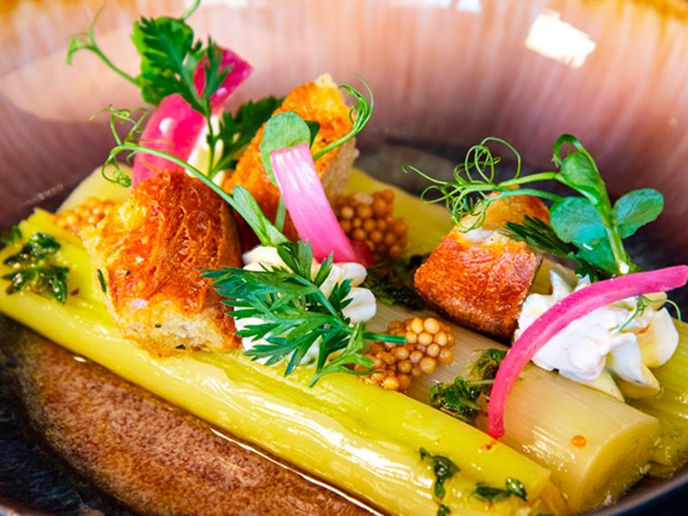 Poireaux grillés et fumés, enveloppés dans de délicates feuilles de nori, accompagnés d’un velouté de poireaux et agrémentés d’une légère crème acidulée.
