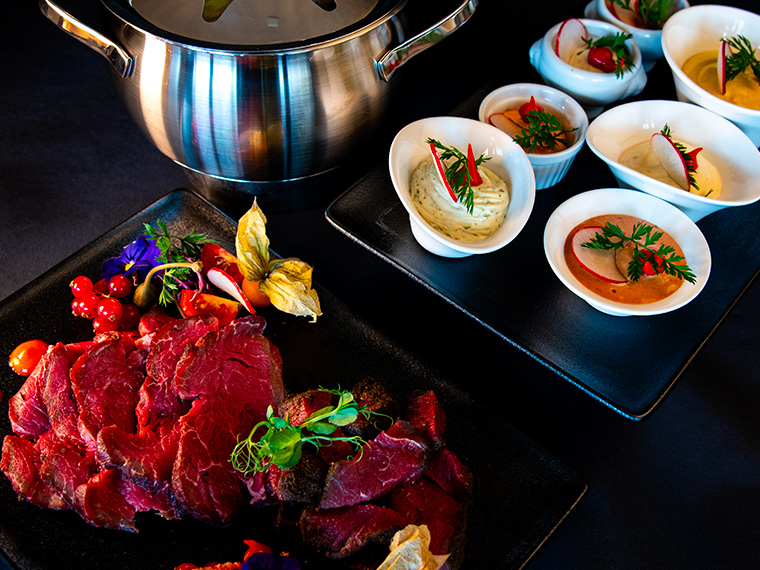 Bouillon de légumes corsée, viande de bœuf mariné aux épices, boeuf mature, farandole des sauces maison & pommes frites.